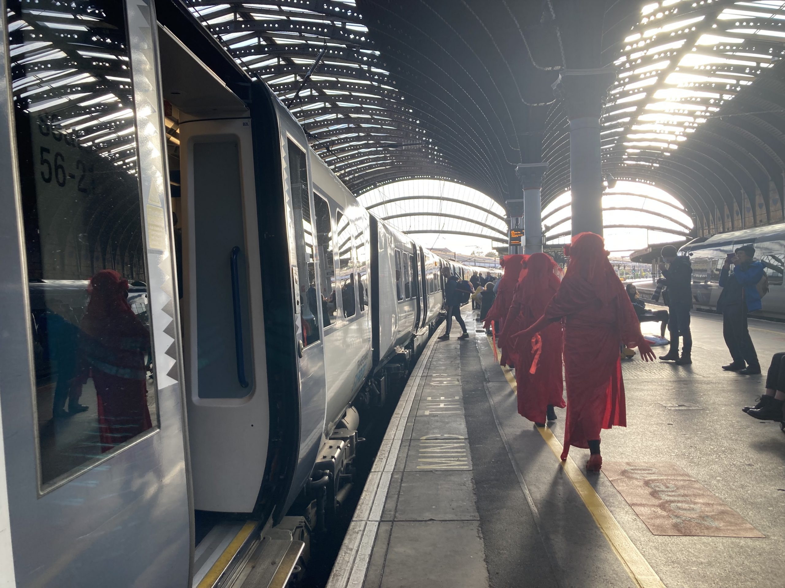In another stop on the pilgrimage to COP26, which began in Truro on 31 October, the Red Rebel Brigade participated in a solemn walk through the station, supported by local climate activists and Extinction Rebellion.