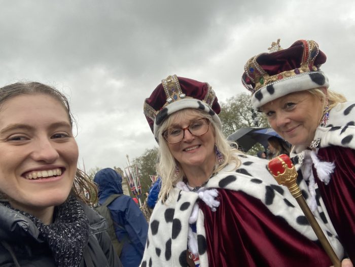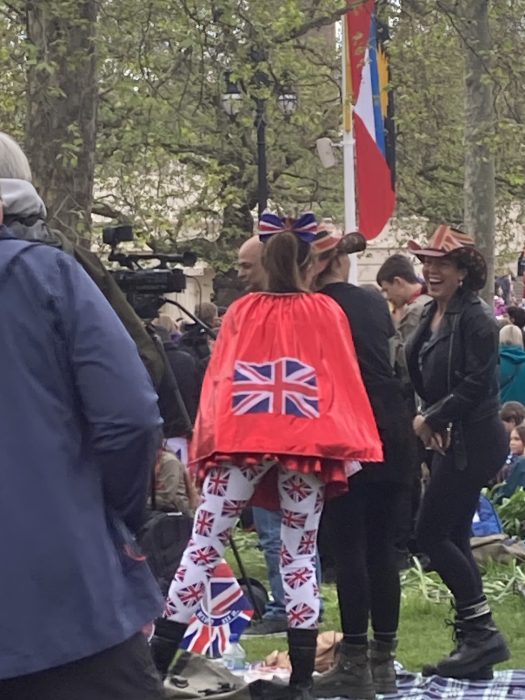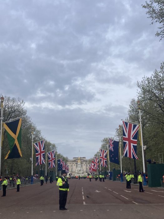 Traversing my way to the city centre Mall early on Saturday morning, a note of dulled anticipation hung in the air. Some travellers paused for photos of Buckingham Palace or the Union Jacks that adorned the streets, but most royal watchers seemed more intent on dutifully queueing up for their morning cup of tea. Most notable to me was the absence of protestors in this area. There was neither a placard nor a ‘not my king’ shirt to be seen – a phenomenon I later learned was because they had been designated to Trafalgar Square to avoid showing such disagreement on the international broadcast.