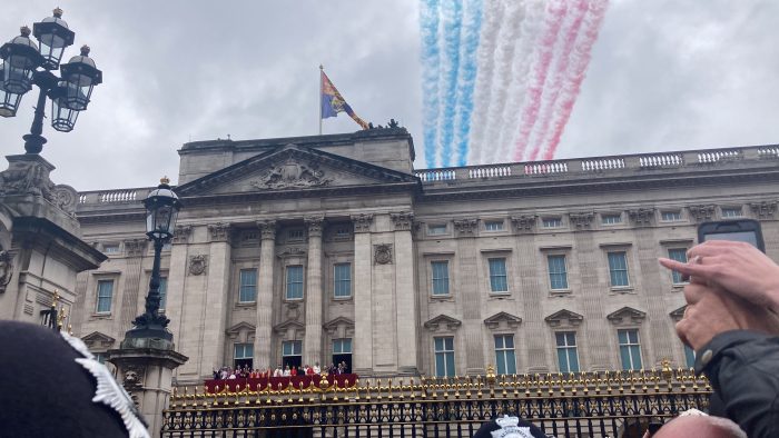 The family waved, the crowds cheered, the Red Arrows roared past, and Prince Louis invented his own royal clap, to the subsequent joy of the internet. A surprising encore from symbolically robe-laden Charles and Camilla ended the impromptu party eventually, and the Union Jack adorned fans wandered off to tube stations, media interviews and to investigate the various TV news sets lining the area. “That’s Trevor McDonald, oh I like him!” was heard echoing again and again as people crammed around the fence in hopes of appearing in the background of the BBC set. And I had just never realised that Trevor had so many dedicated fans!