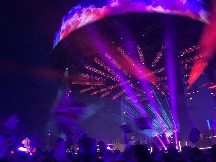 The flags and colour changing bracelets, along with stunning light displays, drones and an irreplaceable backdrop orchestrated an unmissable visual cacophony of celebration; at least for those who could look past their own conflicting feelings on monarchical rule.