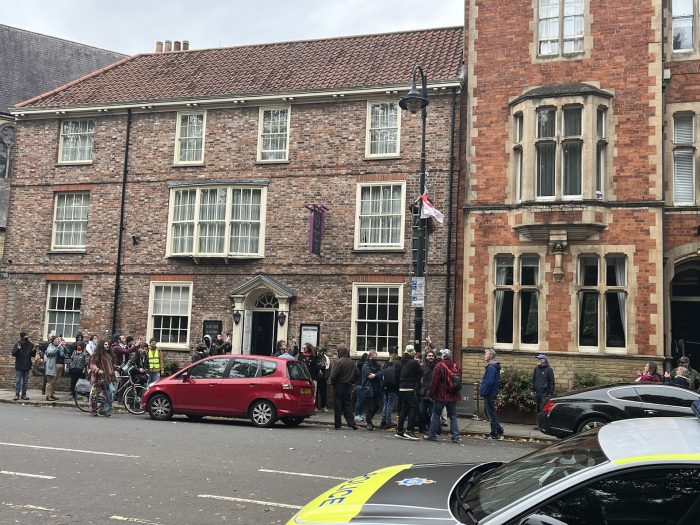 The peaceful protest attracted many onlookers, in the form of passers-by; people watching from the windows of the hotel opposite; and a small police presence. Overall, the public seemed fairly neutral, if not supportive, of the action, up until the pulling down of the St George’s flags from the lampposts. Some onlookers then began to question the purpose of pulling down the “patriotic flags” and called for their removal to be stopped. However, it seems no counter-protest took place.