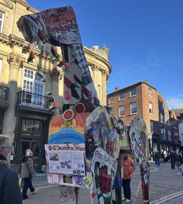The march was led by a replica of the Jenin Horse sculpture; the original was constructed in 2003 at Jenin Refugee Camp, out of debris left by an Israeli invasion. Despite YPA wardens being on hand to de-escalate any confrontational members of the public, there was also a large police presence in town. Police were seen with cameras directed at the protesters.