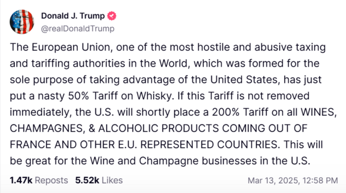 Tariffs are taxes on goods imported into a country. They are paid for not by the exporters (for example, French winemakers or Chinese car companies) but by the importers (American supermarkets, factories, etc.), driving up the cost of buying car parts, or champagne, or stuffed animals from abroad. This means that doing business with countries subject to high tariffs is that much less attractive for American companies, thus harming the economies of countries on the receiving end of tariffs. Trump has placed a 20% tariff on EU goods, a 67% charge on Chinese goods, and a 10% tariff on British goods, along with a host of other countries.