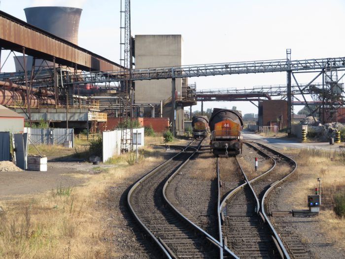 A train goes along the railway lines to a steelworks.