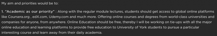 Deb’s first manifesto point says that students should get access to global online platforms, naming Coursera, edX, and Udemy. He states that he will be “working on tie-ups with all the major online education and learning platforms to provide free education to University of York students”. The full manifesto point is shown below.