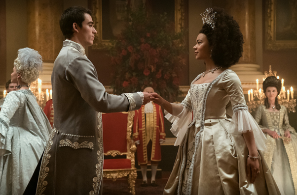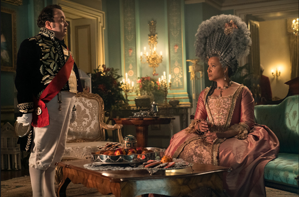 We are introduced to an independent and powerful Charlotte who is outraged that she is having to marry. George and Charlotte meet in a charming and funny interaction in which she (unknowingly) tells the king she does not want to marry him. George seems to respect her agency, telling her that it is her decision whether she marries him or not. Impressed by this, Charlotte decides he isn’t so bad, which may prove to be a mistake…