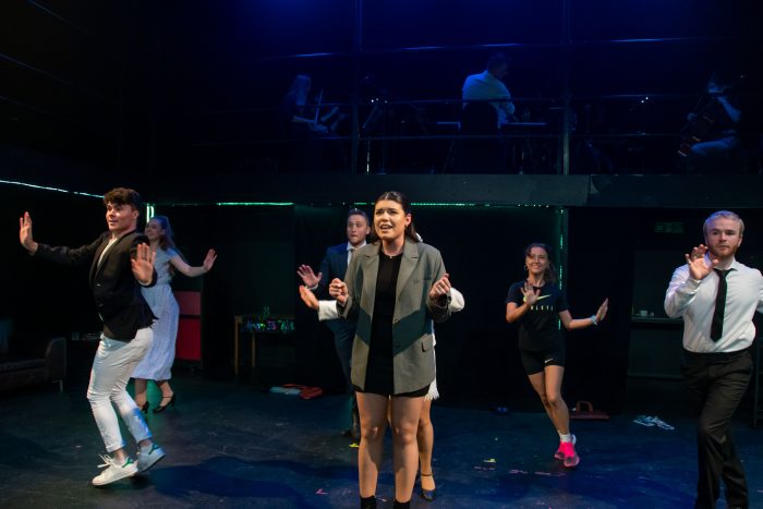 Director Anna Gallon thoughtfully brought Company into the modern world, opening the show with Bobby taking a selfie with the whole audience; a great way to make it feel as though you are one of Bobby’s friends at his birthday party. Theatre@41 is an intimate theatre, but this worked perfectly for the immersive feel of the show. The space is used thoughtfully and cleverly, with a simple set and shining lighting transporting the audience across New York – from Bobby’s apartment, to an open-air terrace and on to a club. The transition between each scene was practically seamless, keeping you grounded in the world of ‘Company’.
